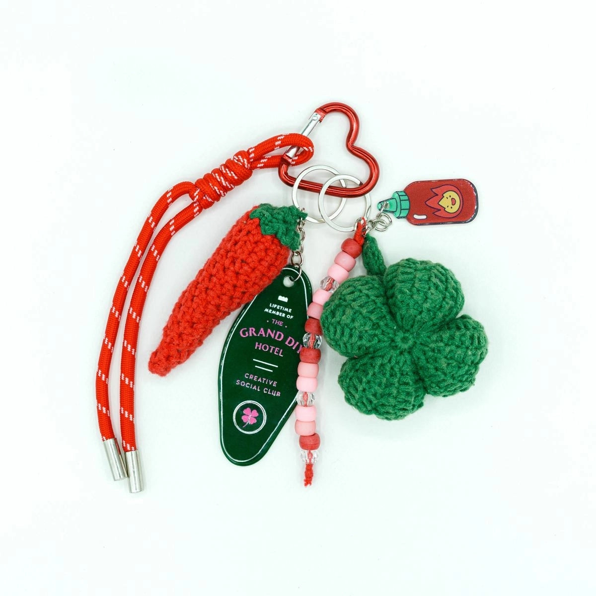 Dieses Komplett-Set enthält alles, was du brauchst, um zwei gehäkelte Glücksbringer zu gestalten: ein vierblättriges Kleeblatt und eine rote Chilischote. Perfekt zum Befestigen an Taschen, Schlüsselbunden, Federmäppchen oder Handys.