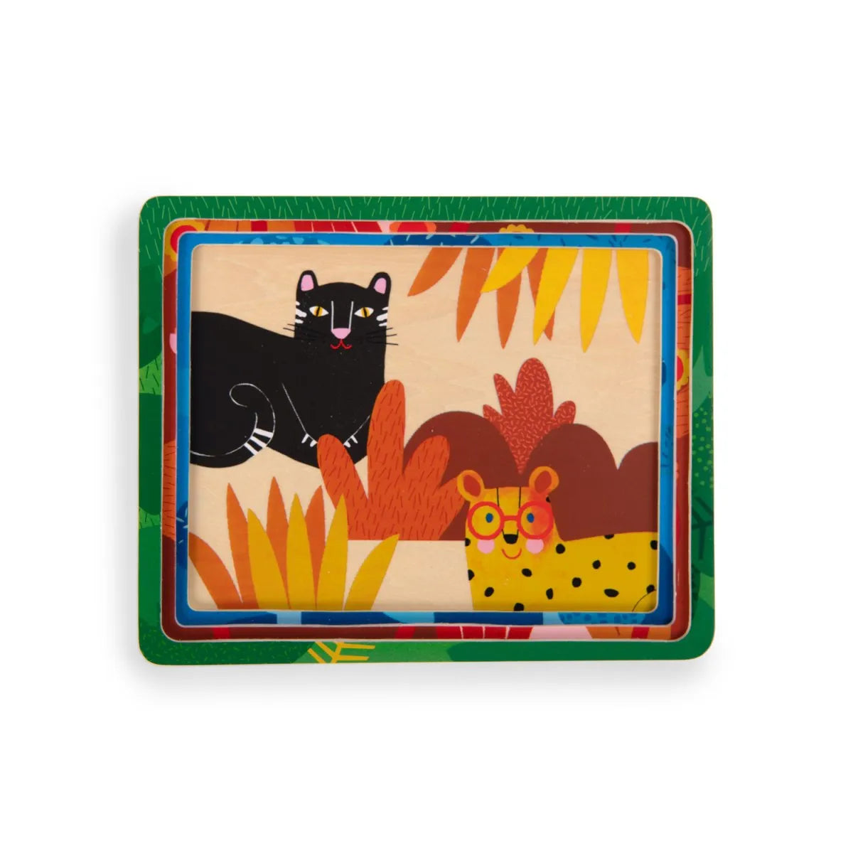 Toupitits Lagenpuzzle aus Holz mit 3 Ebenen. Jede Ebene hat 6 Teile und ist in einer bestimmten Farbe gehalten (blau-rot-grün).