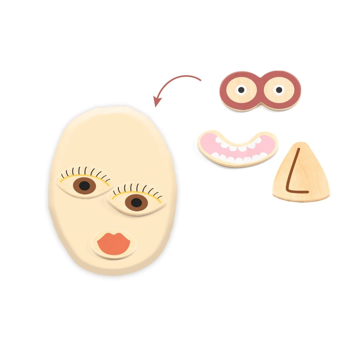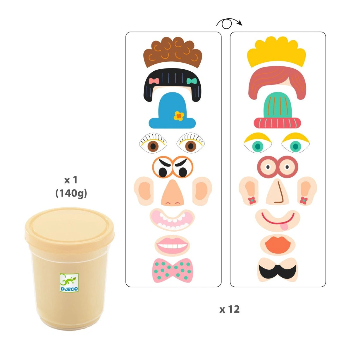 12 beidseitig illustrierte Holzteile, 1 Topf mit gelber Knete (140 g) und 1 Schritt-für-Schritt-Anleitung. Maße: