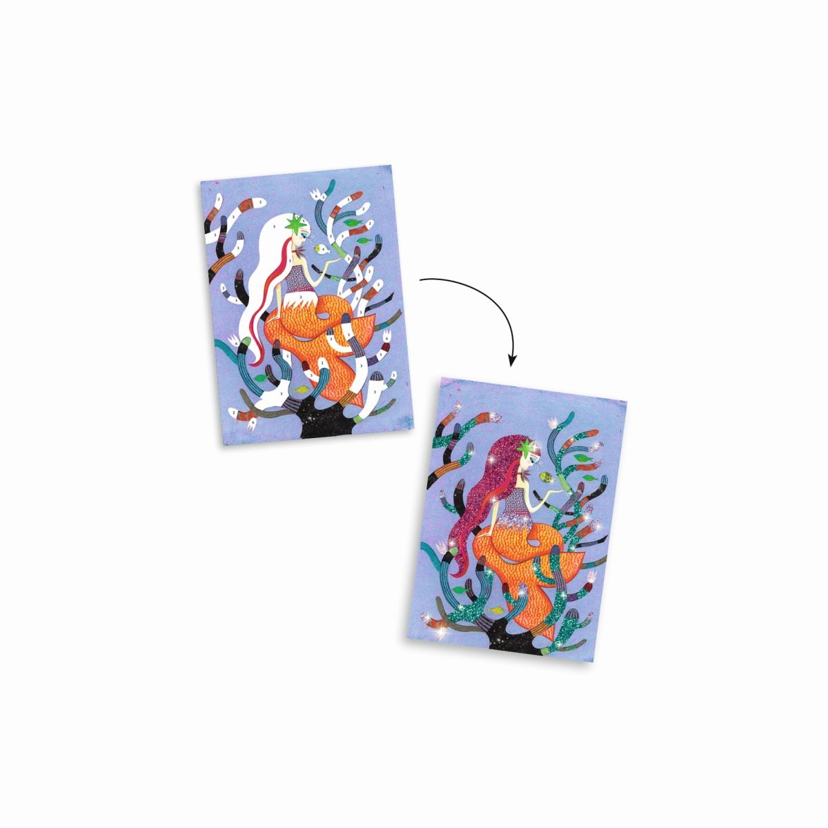 4 Bilder mit bezaubernden Meerjungfrauen, die mit buntem Glitzersand zum Leuchten gebracht werden. Das Kind legt sein Bild in die Schachtel. Dann legt es die vorgeklebten Bereiche mit dem mitgelieferten Werkzeug frei und bestreut sie entsprechend des in der Anleitung angegebenen Farbcodes mit Glitzersand. Sobald das Kind damit fertig ist, glitzern die wundervollen Meerjungfrauen und werden für große Freude sorgen!