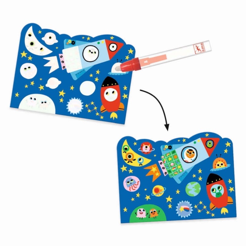 Die Zauber-Malbilder für Kinder ab 18 Monate können mit dem beiliegenden Stift, der mit Wasser befüllt wird, ausgemalt werden. Sobald das Wasser getrocknet ist, lassen sich die Bilder wieder aufs Neue anmalen.