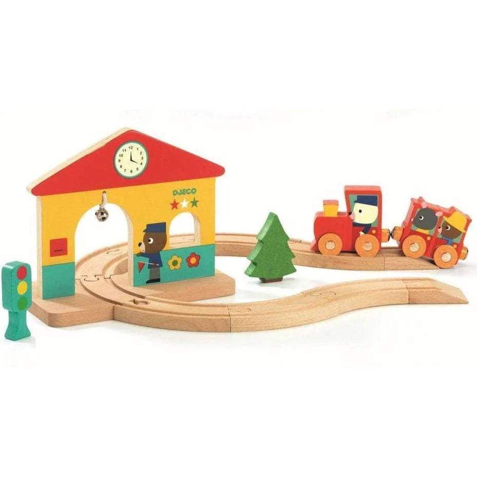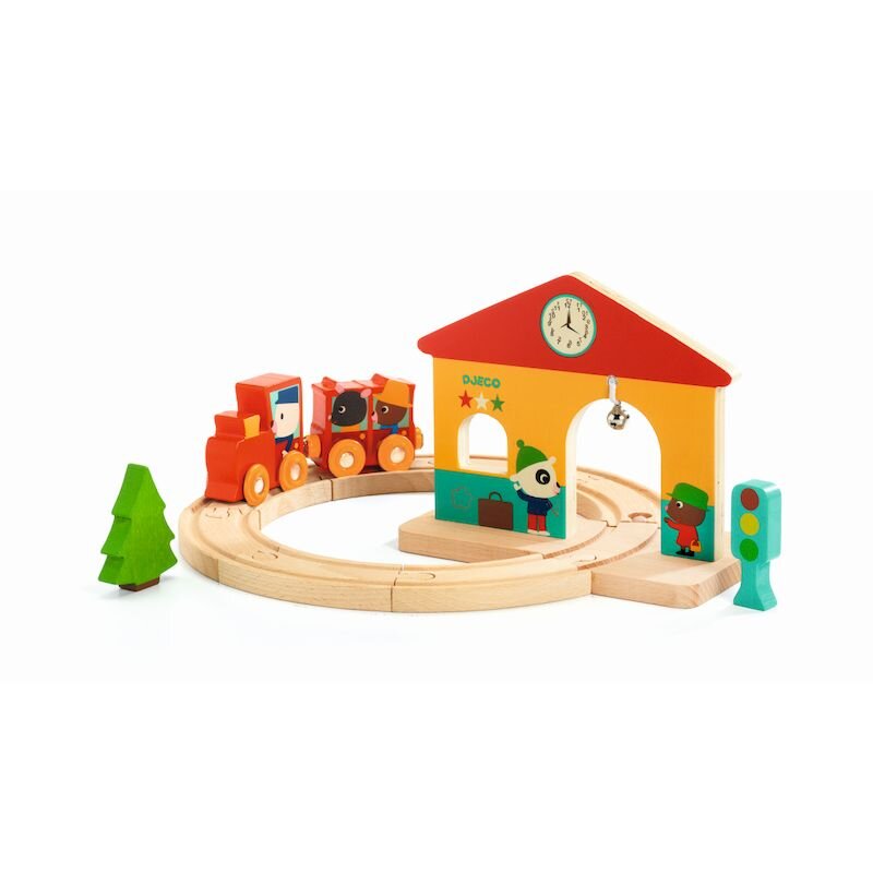 Eine erste kleine Eisenbahn zum Spielen ab 18 Monaten. Mit Schienen, einer Eisenbahn, einem Bahnhof, Ampel und Baum. Die Schienen können als Kreis oder lange Schlange gelegt werden.