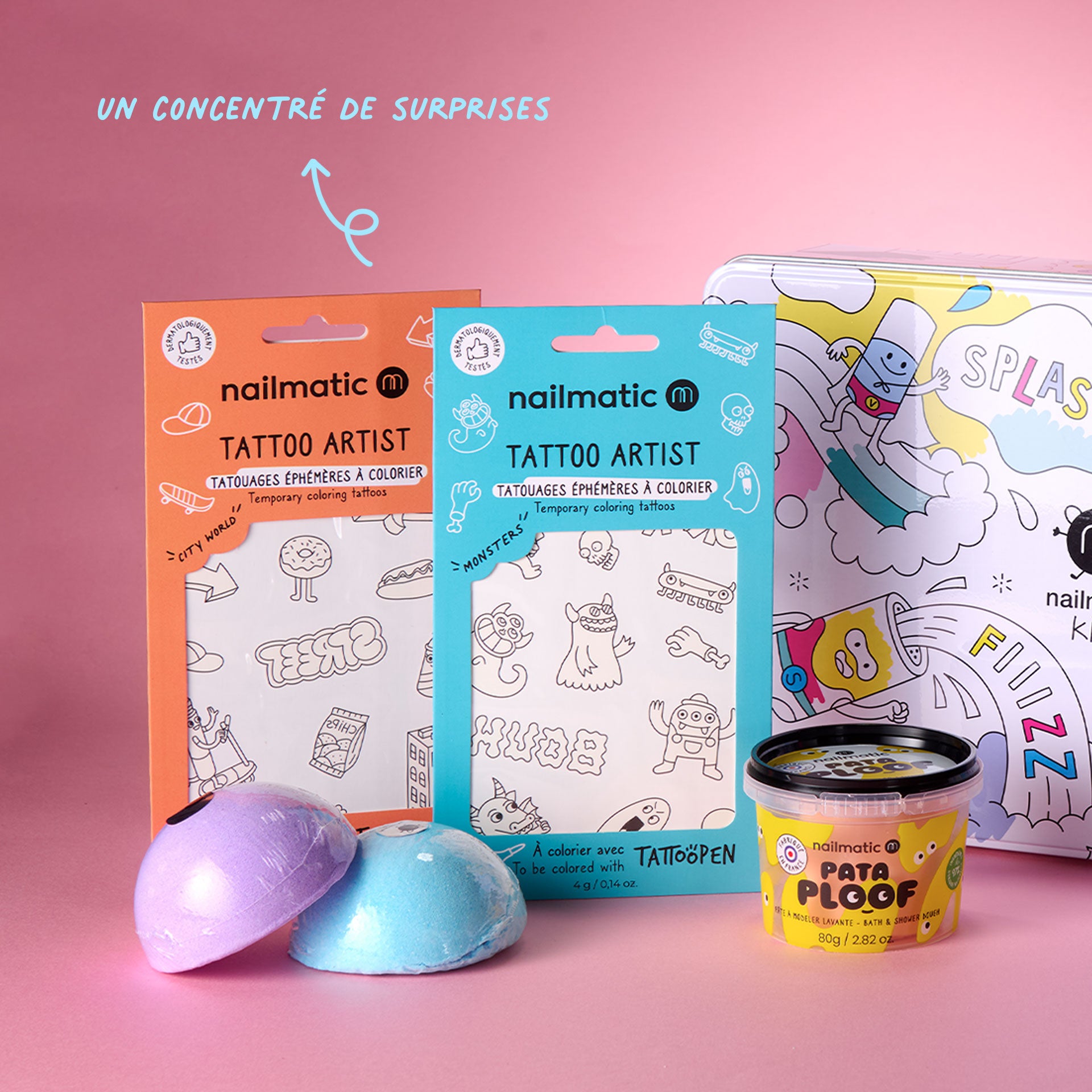 Inhalt: 2 Halbmond-Badbomben, 1 Waschknete, 2 Tattoo-bögen, 1 Tattoo- Stift, 1 Spiel