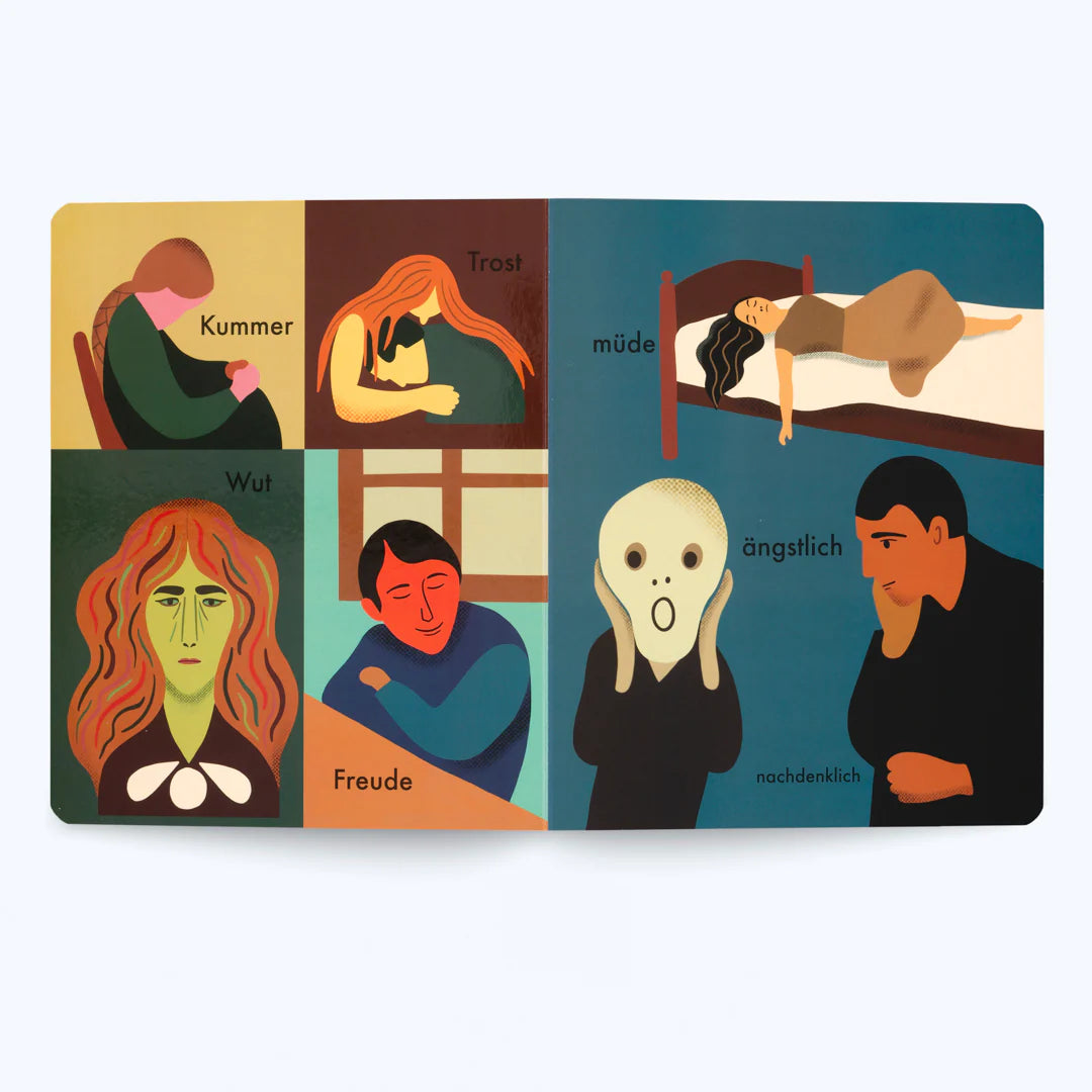 „Meine ersten Wörter - Inspiriert von Edvard Munch" ist ein liebevoll gestaltetes Pappbilderbuch, mit dem Kinder spielerisch ihre ersten Wörter lernen können. Begriffe aus dem Alltag wie Landschaften, Gefühle und Gegenstände werden in farbenfrohen Bildern gezeigt, die von der Kunst und Farbwelt Edvard Munchs inspiriert sind. Das Buch ist aus stabilem Karton gefertigt und liegt gut in kleinen Händen - ideal zum gemeinsamen Anschauen, Entdecken und Sprechen. Auch Erwachsene haben Freude an den ausdrucksstarken Illustrationen. Die besondere Verbindung von Kunst und Sprache macht dieses Buch zu einem schönen Begleiter für die ganze Familie.