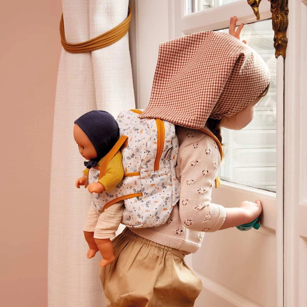 Ein wunderschöner und cleverer Rucksack! 2-in-1: ein Tragesitz für Spaziergänge mit seiner kleinen Puppe auf dem Rücken. Die Klettverschlussschlaufen halten es gut fest. Und ein Rucksack, um alle Habseligkeiten der Puppe mitzunehmen. Dank der einstellbaren Riemen kann der Rucksack an die Größe des Kindes angepasst werden.