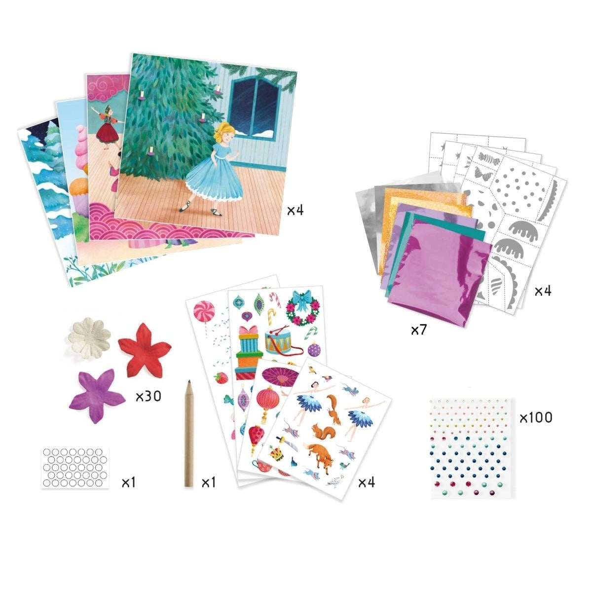Die 4 Illustrationen greifen die 4 zentralen Bilder des berühmten Balletts auf: Weihnachtsfeier, Schneeflocken-Walzer, Tänze der Welt und der Pas de deux im Palast der Zuckerfee
