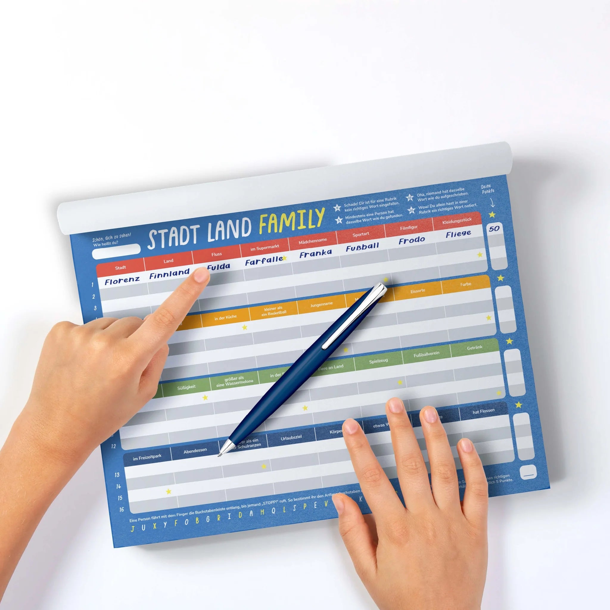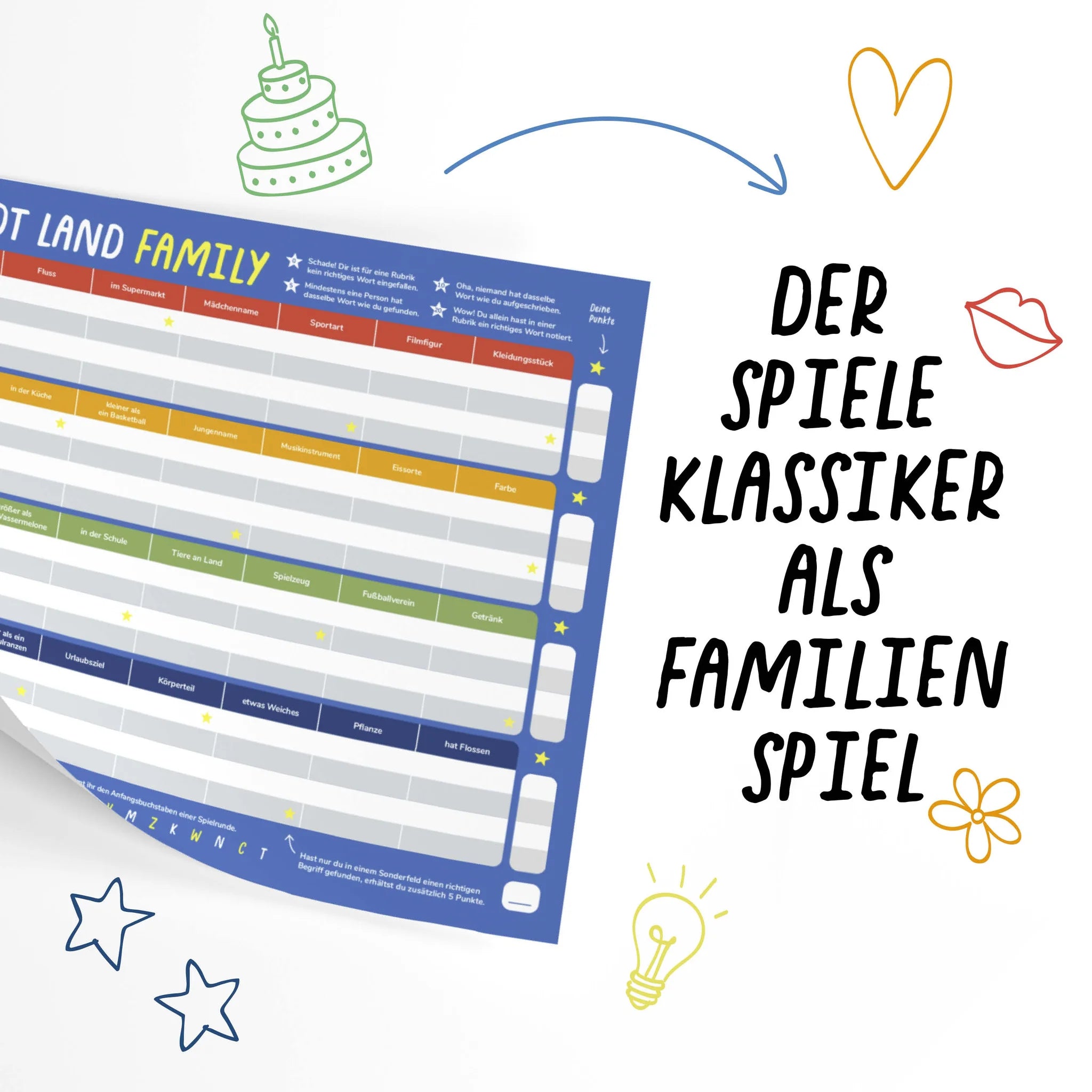 In "Stadt Land Family" dreht sich alles um das Erkunden und gemeinsame Erleben von außergewöhnlichen Kategorien, die weit über die traditionellen Themen wie Länder, Städte und Flüsse hinausgehen. Freut euch auf spannende und humorvolle Kategorien wie Superhelden, Lieblingsspeisen, Urlaubserinnerungen und vieles mehr. Diese besonderen Themen regen die Fantasie an und bieten eine unterhaltsame Möglichkeit, miteinander ins Gespräch zu kommen und Neues über eure Lieben zu erfahren.