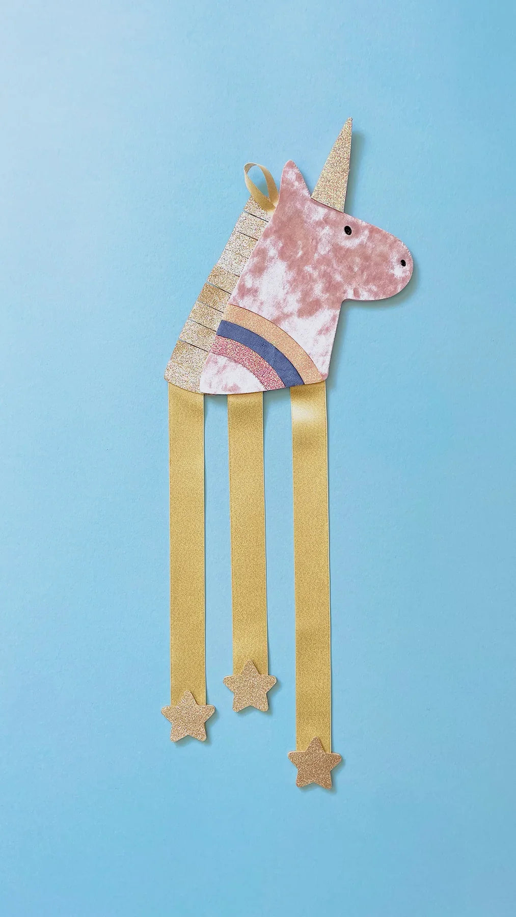 Einhorn aus weichem Samt und glitzerndem Stoff. Hübsche Satinbänder mit glitzernden Sternen.