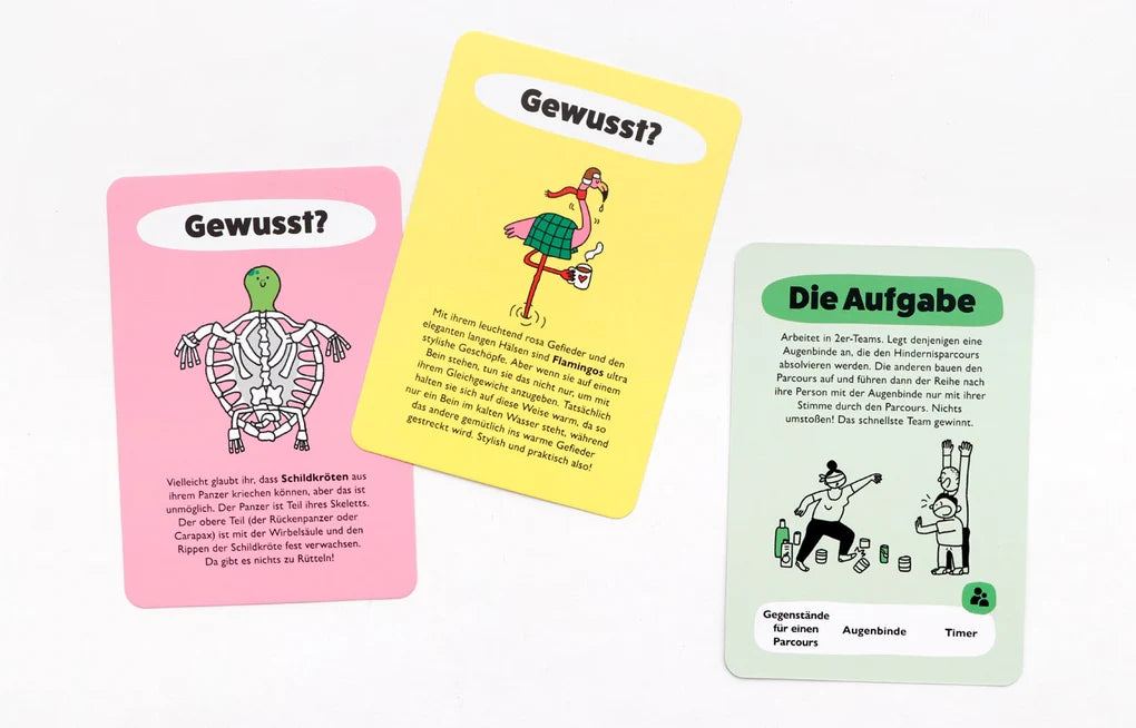 Schließt euch mit euren Freund*innen oder Kindern zusammen, um im Wettkampf mit den Tieren den Sieg davonzutragen! Erfahrt dabei faszinierende Fakten über Affen, Flamingos & Co., während ihr euch 50 tierischen Herausforderungen stellt. Das Kartenspiel ist für jede Gruppengröße geeignet und ist auch für Kinder leicht verständlich.
