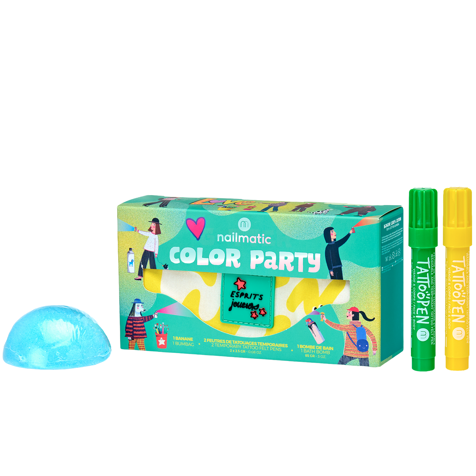 Inhalt: 1 Gürteltasche, 1 Halbmond-Badebombe, 2 Tattoo-Stifte