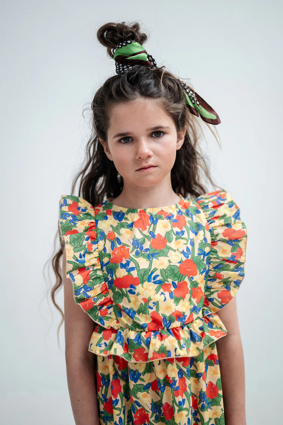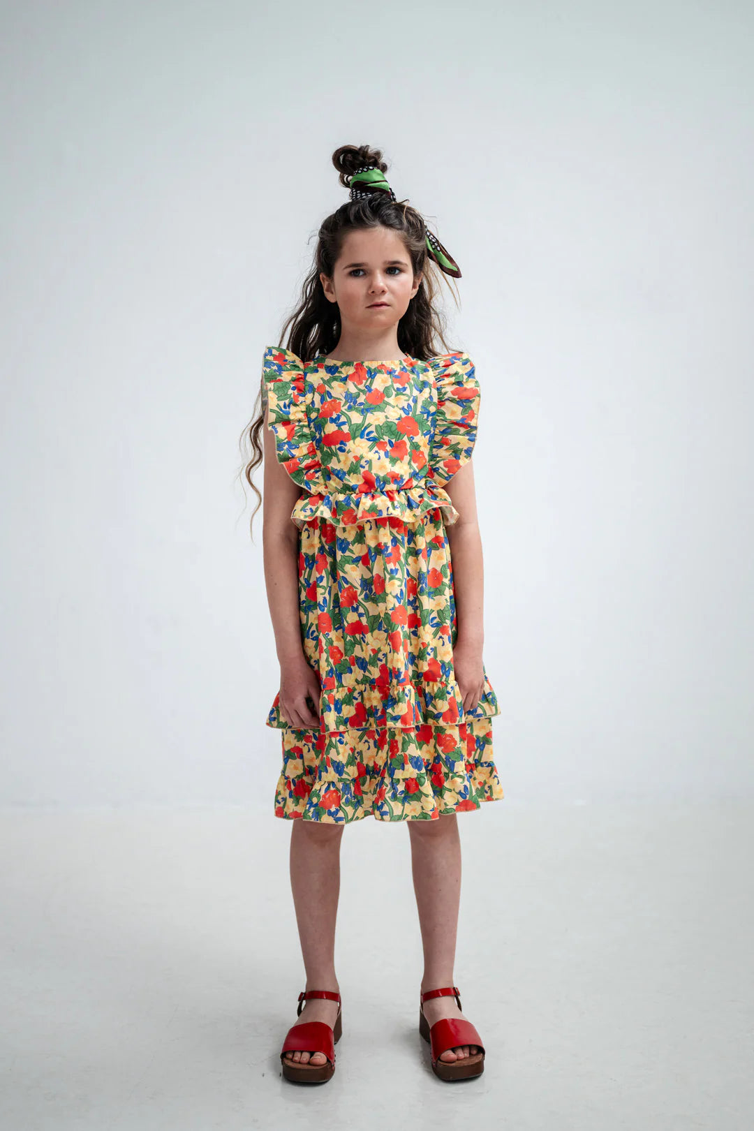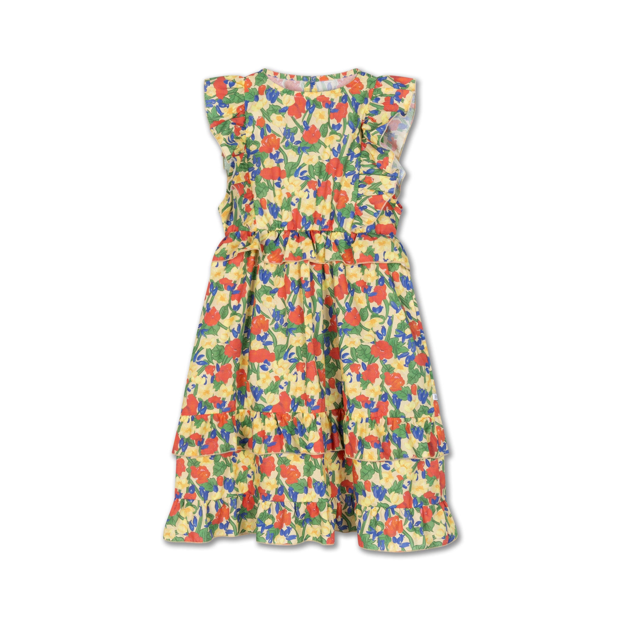 Dieses Kleid mit seinem lebhaften Wildblumenmuster und den markanten Rüschendetails verleiht dem Sommer einen verspielten Touch. Es ist aus 100 % Bio-Baumwolle gefertigt, hat eine bequeme, knielange Silhouette und besticht durch auffällige Rüschen an Schultern, Taille und Saum, die für Schwung und einen modernen Look sorgen.