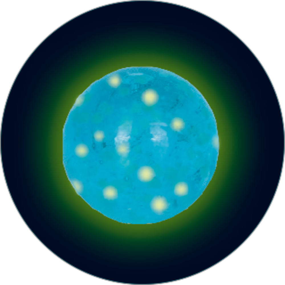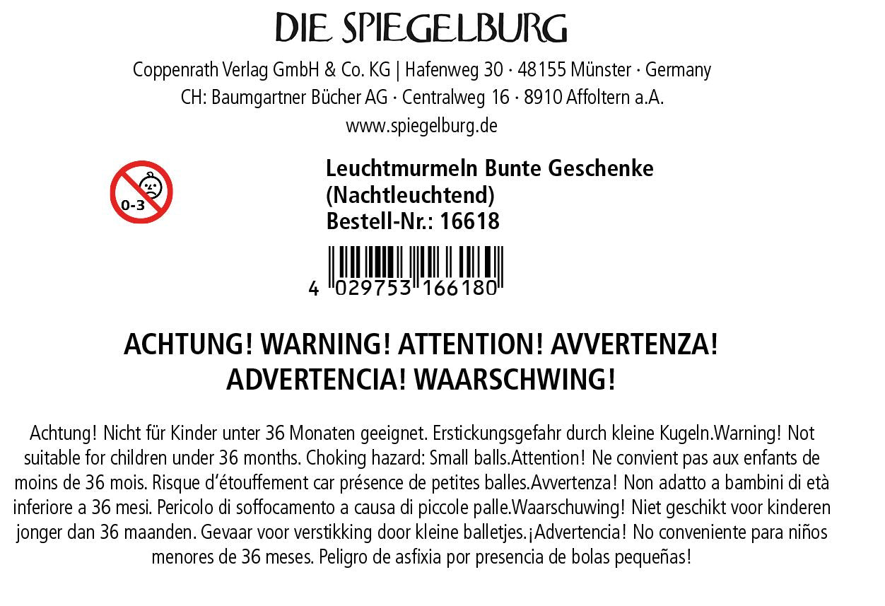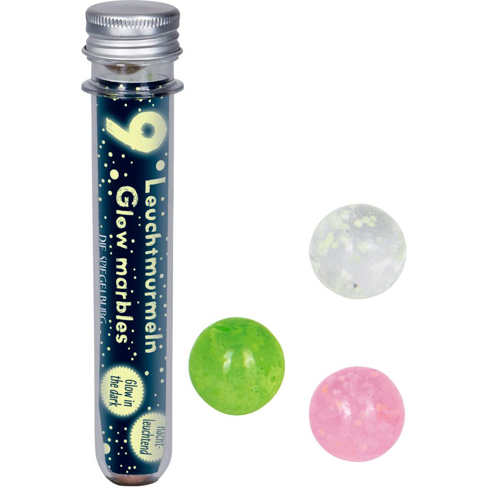 Set aus neun Glasmurmeln, die geheimnisvoll im Dunkeln leuchten. Verpackt in einem schönen Reagenzglas.
