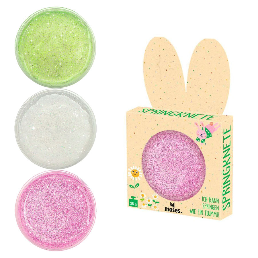 Kneten, teilen, hüpfen lassen: Diese glitzernde Knete sorgt für vielseitigen Spielspaß: Sie lässt sich formen, zerreißen und springt wie ein Flummi über den Tisch. Die frühlingshaften Farben machen die Knete zu einer beliebten kleinen Überraschung – nicht nur im Osternest.