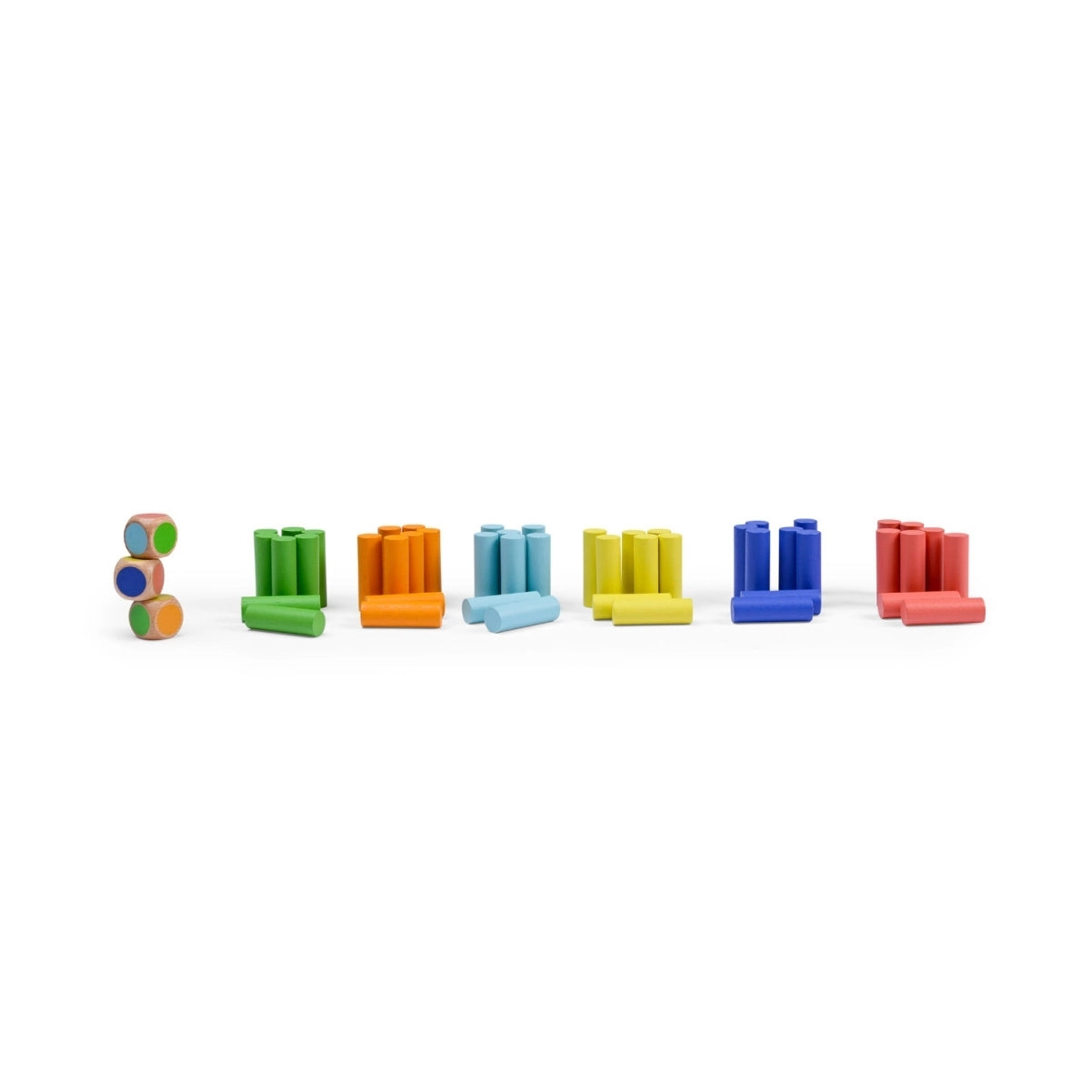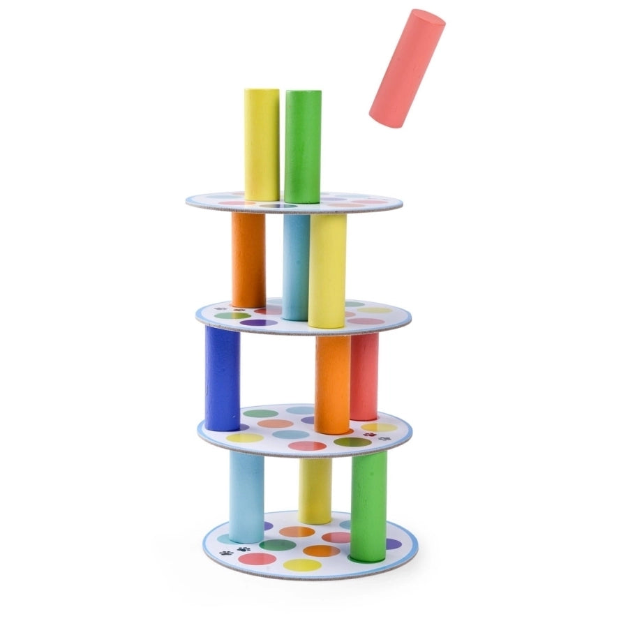 Baue den höchsten Turm, den du kannst. Abwechselnd fügen die Spieler Zylinder gemäß der durch den Würfel angezeigten Farbe auf die runden Platten hinzu, während sie sicherstellen, dass der Turm nicht umkippt.