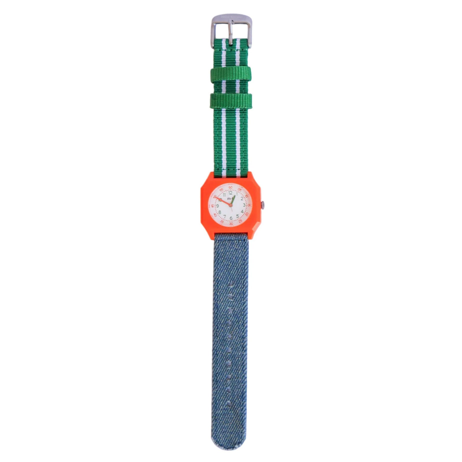 Material: Gehäuse recycelter Thermoplast, Mineralglas, Armband aus recyceltem Nylon mit starker Stahlschnalle, Band waschinenwaschbar bis 40°C