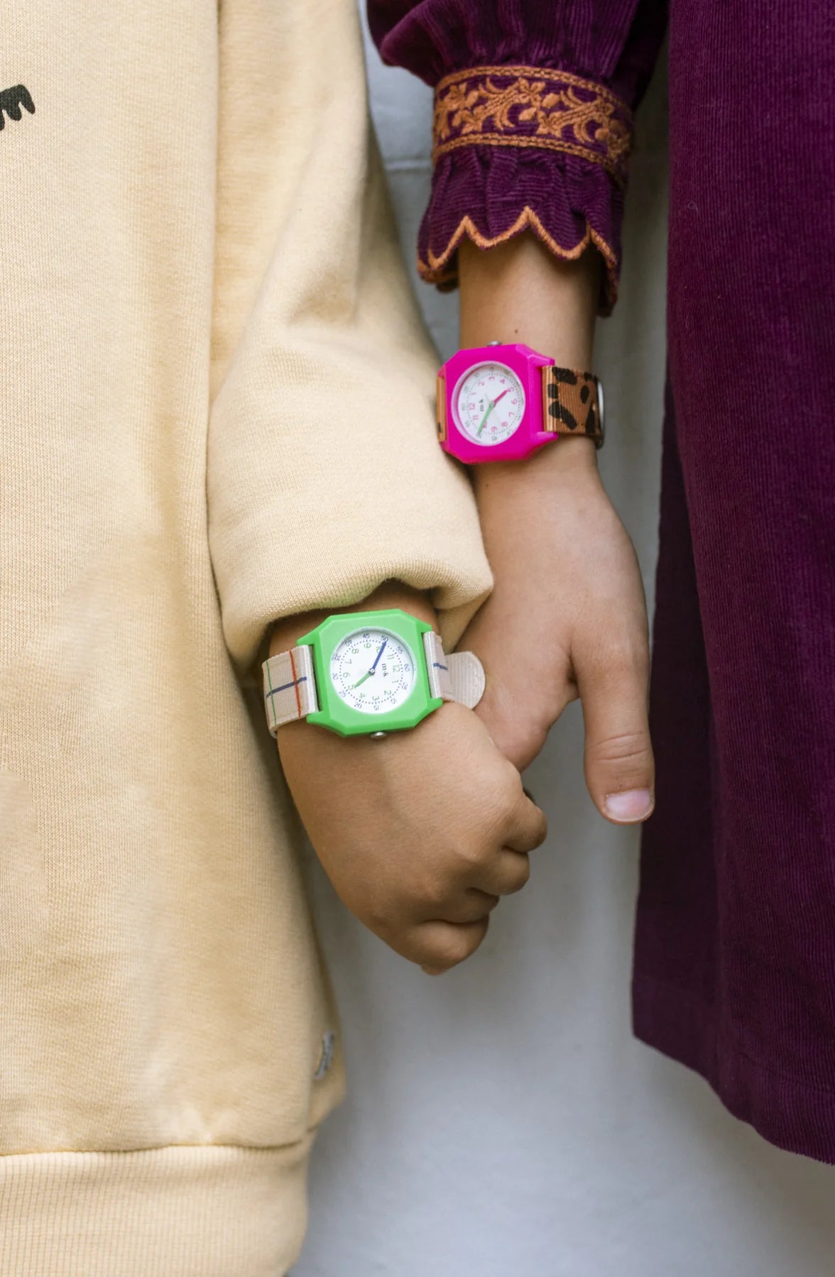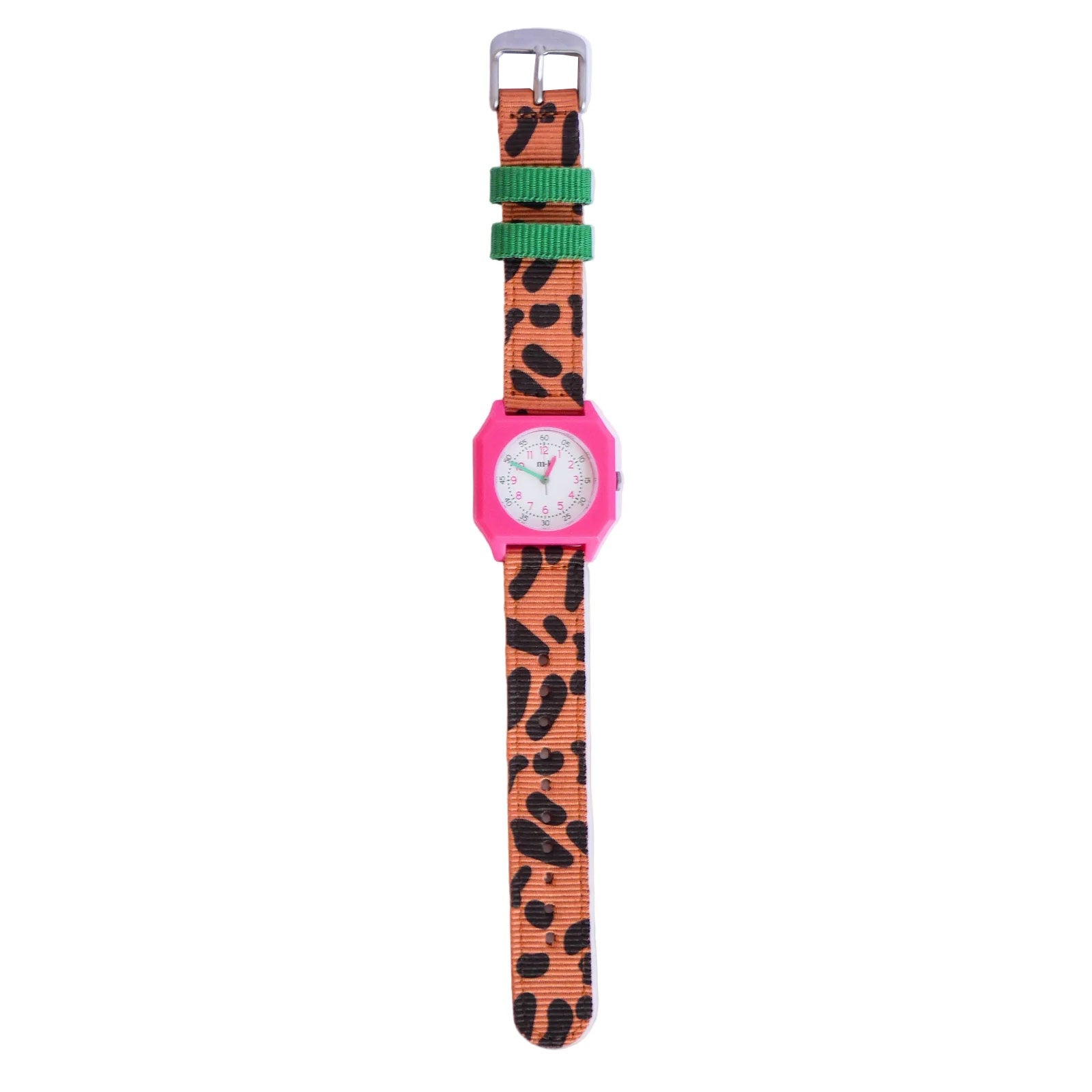 Wunderschöne Kinder Armbanduhr der Firma Kyomo. Die Uhr hat ein stoßfestes japanisches Uhrwerk und ist mit einem robusten Mineralglas ausgestattet. Um auch jedes Kinder-Abenteuer mitzumachen, ist es auch wasserdicht. Die Uhr verfügt über gut lesbare Zifferblätter mit starkem Farbkontrast, um das Erlernen der Lesezeit zu einer einfachen Aufgabe zu machen. Alle Stunden und Fünf-Minuten-Schritte sind ausgeschrieben, die Minuten dazwischen sind mit kleinen Punkten markiert. Die Leopard-Uhr ist eine von drei Uhren aus der Zusammenarbeit zwischen Mini Kyomo und dem Designstudio Taxi Brousse.
