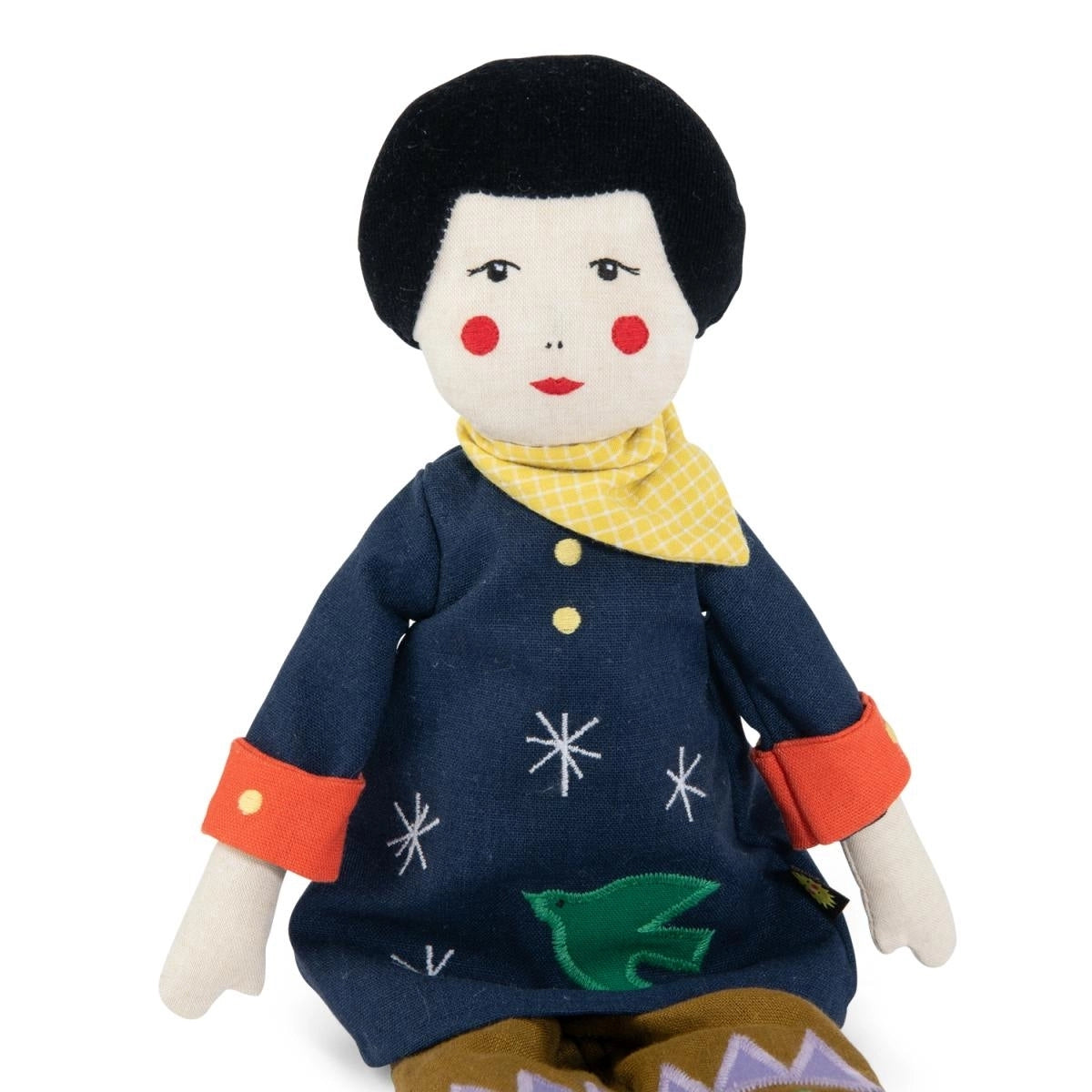 Die Puppe Oko wurde von Julie Daleyden für die Kollektion Les Comètes Filantes entworfen. Sie trägt Oberteil und Hose aus Leinen-Baumwoll-Stoff, wunderschön bestickt mit winzigen Details direkt aus ihrer fantastischen Welt.