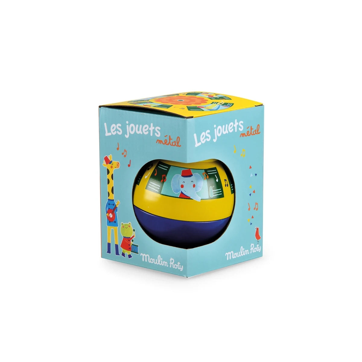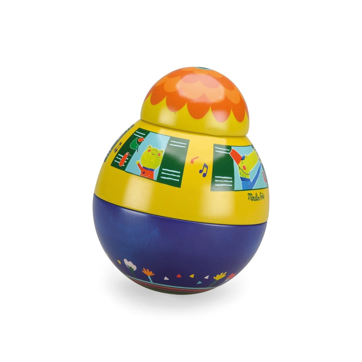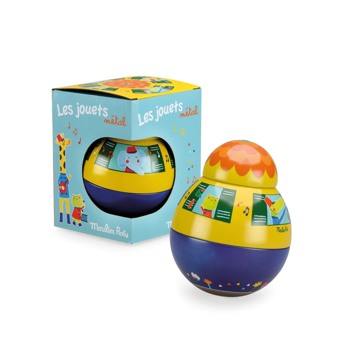 Eine farbenfrohe Stehauffigur aus Metall, verziert mit vielen fröhlichen, bunten Tiermotiven. Sie schaukelt sanft hin und her und ertönt dabei ein fröhliches Glöckchen, ohne jemals umzukippen. Babys werden es lieben, damit zu spielen.