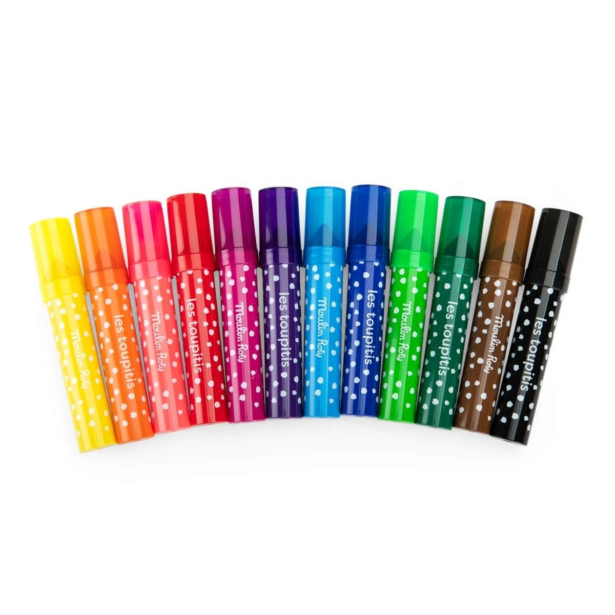 Die 12 leuchtenden Filzstifte verfügen über eine spezielle konische Spitze, die das Papier selbst bei starkem Druck nicht zerdrückt oder zerreißt und so kräftige Striche aus jedem Winkel ermöglicht. Die Stifte fördern die Kreativität der Kleinen und sind praktischerweise mit Wasser auswaschbar.