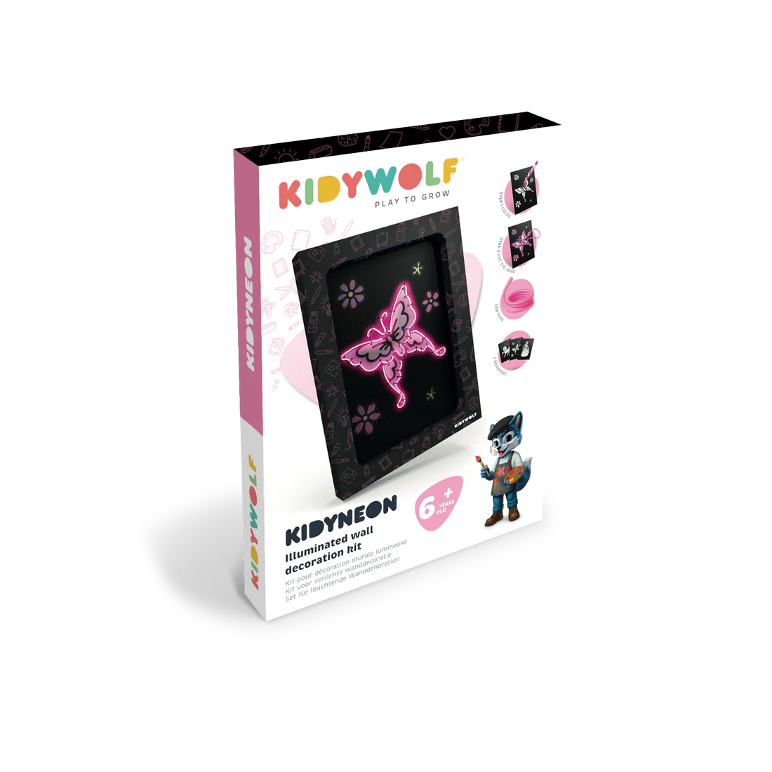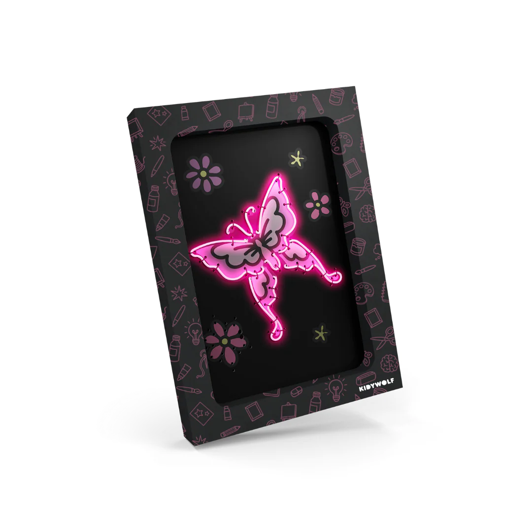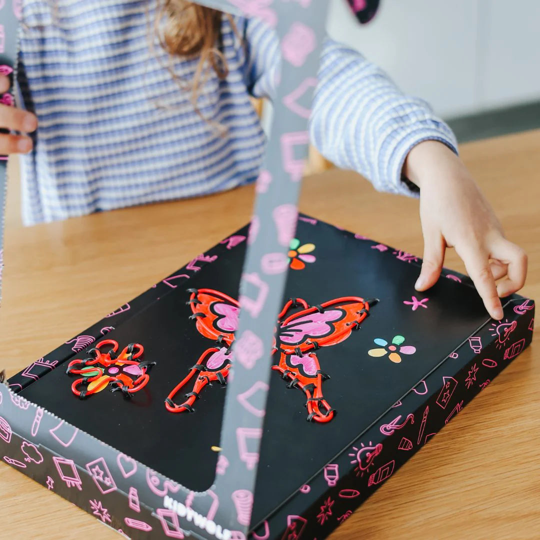 KIDYNEON revolutioniert kreative Freizeitgestaltung mit einem Hauch von magischem Licht! Mit neonfarbenem Garn, das in eine vorgelochte Platte eingelegt wird, gestalten Kinder leuchtende, originelle Bilder, die sie stolz präsentieren werden. Eine Bastelaktivität, die die Kreativität anregt und gleichzeitig Feinmotorik und Konzentration fördert. Ganz ohne Bildschirm, einfach faszinierend!