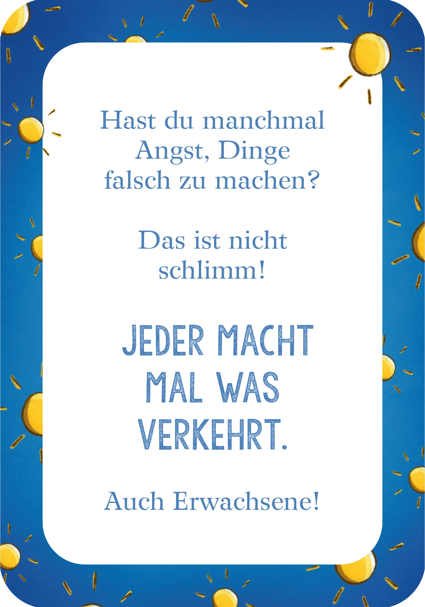 In dieser liebevoll gestalteten Kartenbox befinden sich 50 Affirmationskarten für Kinder. Perfekt geeignet als Mutmacher für den Schulstart, aber auch für andere Situationen, wie den Eintritt in den Kindergarten, einen aufregenden Auftritt, einen Umzug etc.
