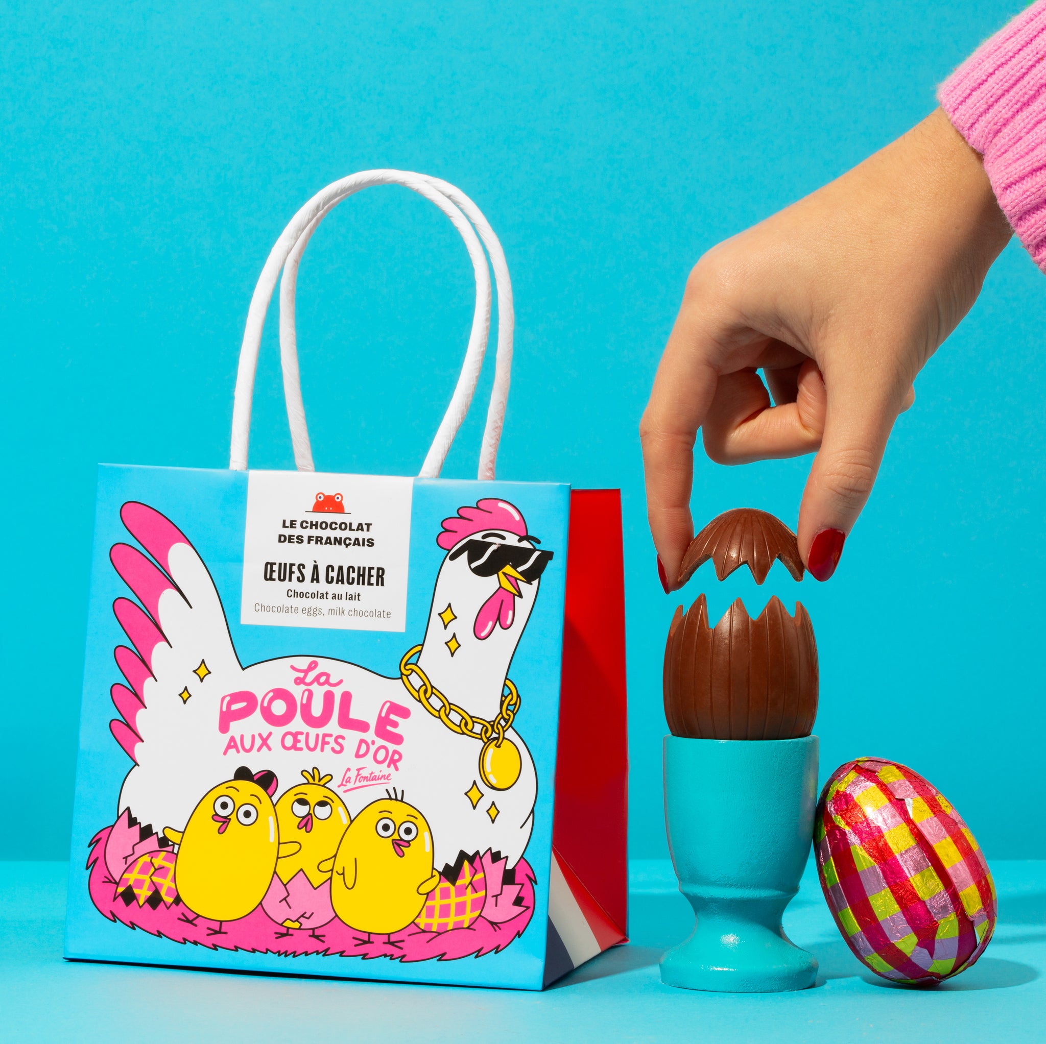 Diese Gans, die goldene Eier legt, lässt sich nicht täuschen! Greif in ihren Beutel und entdecke 5 hohle Eier aus zartschmelzender Milchschokolade. Jetzt bist du an der Reihe: Verstecke sie im Garten und die Suche kann beginnen!