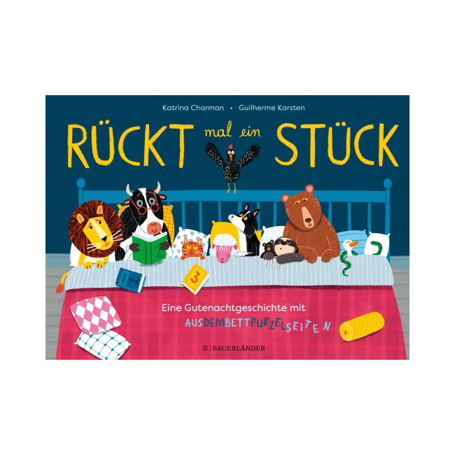 Wenn 10 ins Bett sollen, dann wird beim Abendritual schon mal aus dem Bett gekullert, gestolpert und übereinandergeplumpst. Immer heißt es wieder »Rückt mal ein Stück«. Es sollen aber doch alle schlafen geh'n. Ist in diesem großen Bett wirklich Platz für 10?! »Rückt mal ein Stück«, bestimmt das Huhn. Einer fällt raus. Und nun? Im Bett sind nur noch 9. Jetzt muss doch Platz für alle sein. »Rückt mal ein Stück!«, gackert es da wieder. Und schon plumpst noch einer raus. Jetzt sind es nur noch 8. Wird das jemals eine ruhige Nacht?