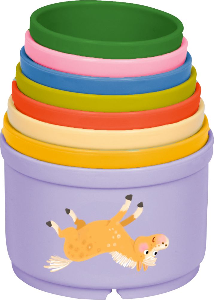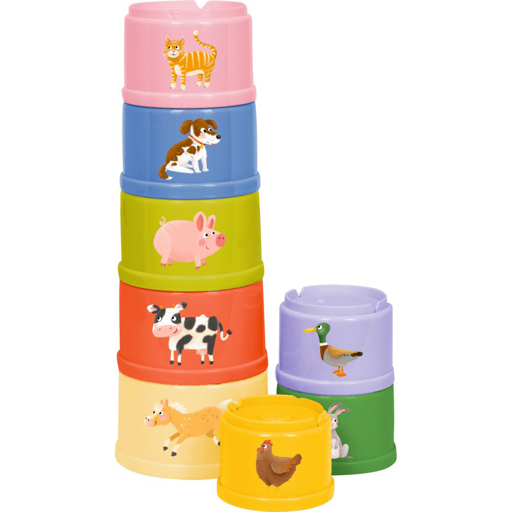 Die Stapelbecher Bauernhof bringen Spielspaß für die Kleinsten. Das bunte Set aus 8 Bechern zeigt fröhliche Bauernhoftiere und lädt zum Stapeln, Bauen und Sortieren ein. Mit einer Größe von ca. 8 x 8 x 34,5 cm lassen sich hohe Türme bauen, die sofort wieder umgestoßen werden können – ein Spiel, das Kinder begeistert. Die Becher sind abwischbar und somit praktisch im Alltag.