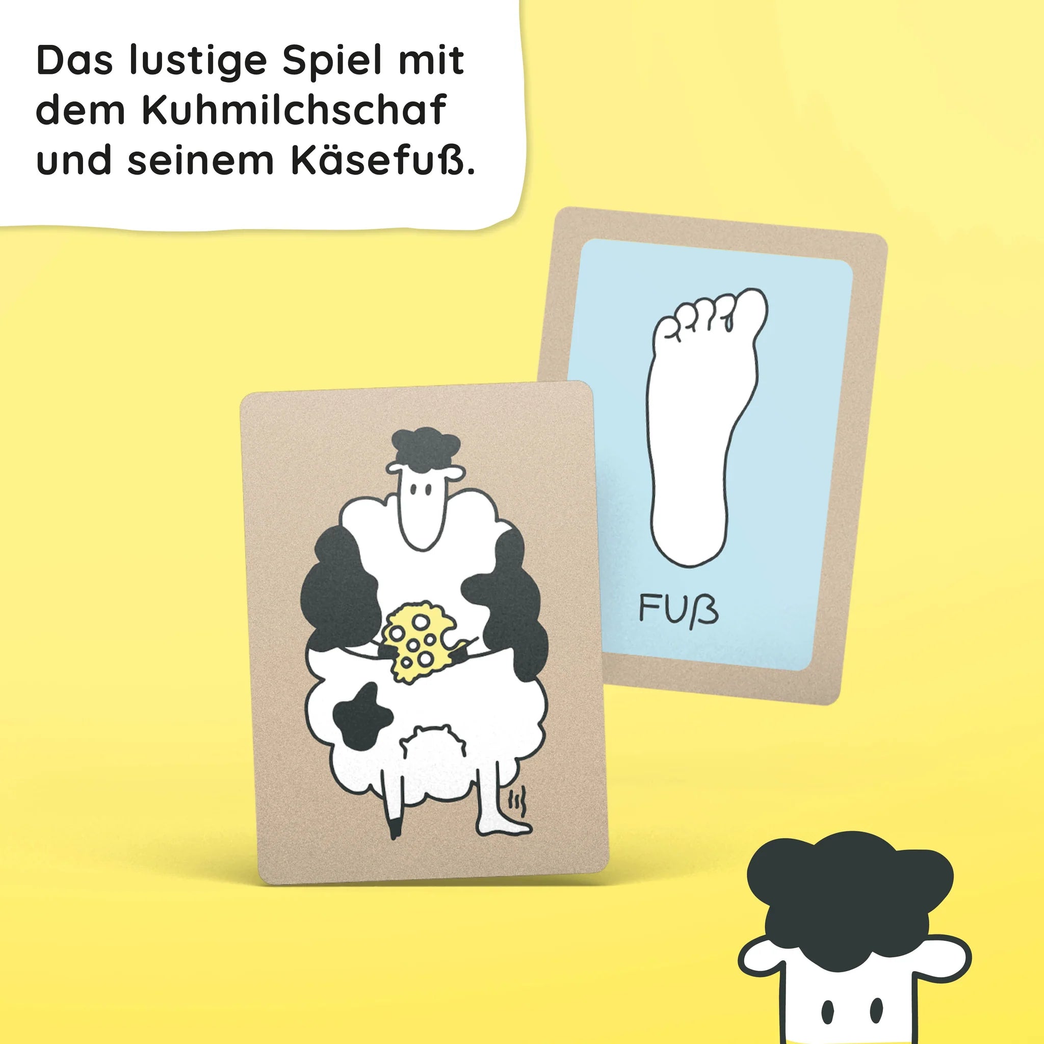 "Kuhmilchschafkäsefuß" ist ein Kartenspiel ab sieben Jahren, bestehend aus 110 liebevoll gestalteten Karten. Eine Spielrunde dauert ungefähr 20 Minuten. Um zu gewinnen, bedarf es vollster Konzentration und Aufmerksamkeit, sowie schneller Reflexe. Reihum deckt jeder Spieler die oberste Karte seines eigenes Kartenstapels auf. Wann immer ein zusammengesetzter Begriff (wie z.B. "Kuhmilch") gleichzeitig mit seinen Einzelbegriffen (in dem Fall "Kuh" und "Milch") aufgedeckt ist, muss in Windeseile auf das Kuhmilchschaf geschlagen werden.