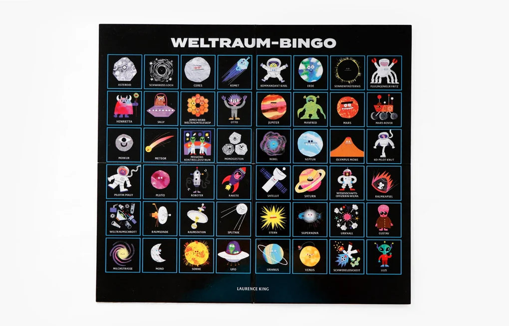 Auf diesem Spielbrett sind 48 Illustrationen zu Weltraumthemen - von Astronaut*innen und Raketen bis hin zu Planeten, Supernovas und Meteoren. Es gibt sogar den ein oder anderen Außerirdischen und UFOs! Wer zuerst alle Felder auf der eigenen Bingokarte markieren konnte, ruft laut „BINGO!" und gewinnt!