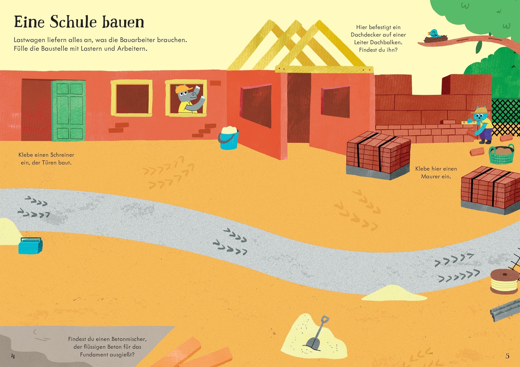 Hilf den Bauarbeitern eine Schule, ein Hochhaus und einen Spielplatz zu bauen. Die 170 wiederablösbaren Sticker helfen dir die Baustellenfahrzeuge und Arbeiter immer wieder neu zu platzieren und dabei spielerisch mehr darüber zu lernen, wie etwas gebaut wird.